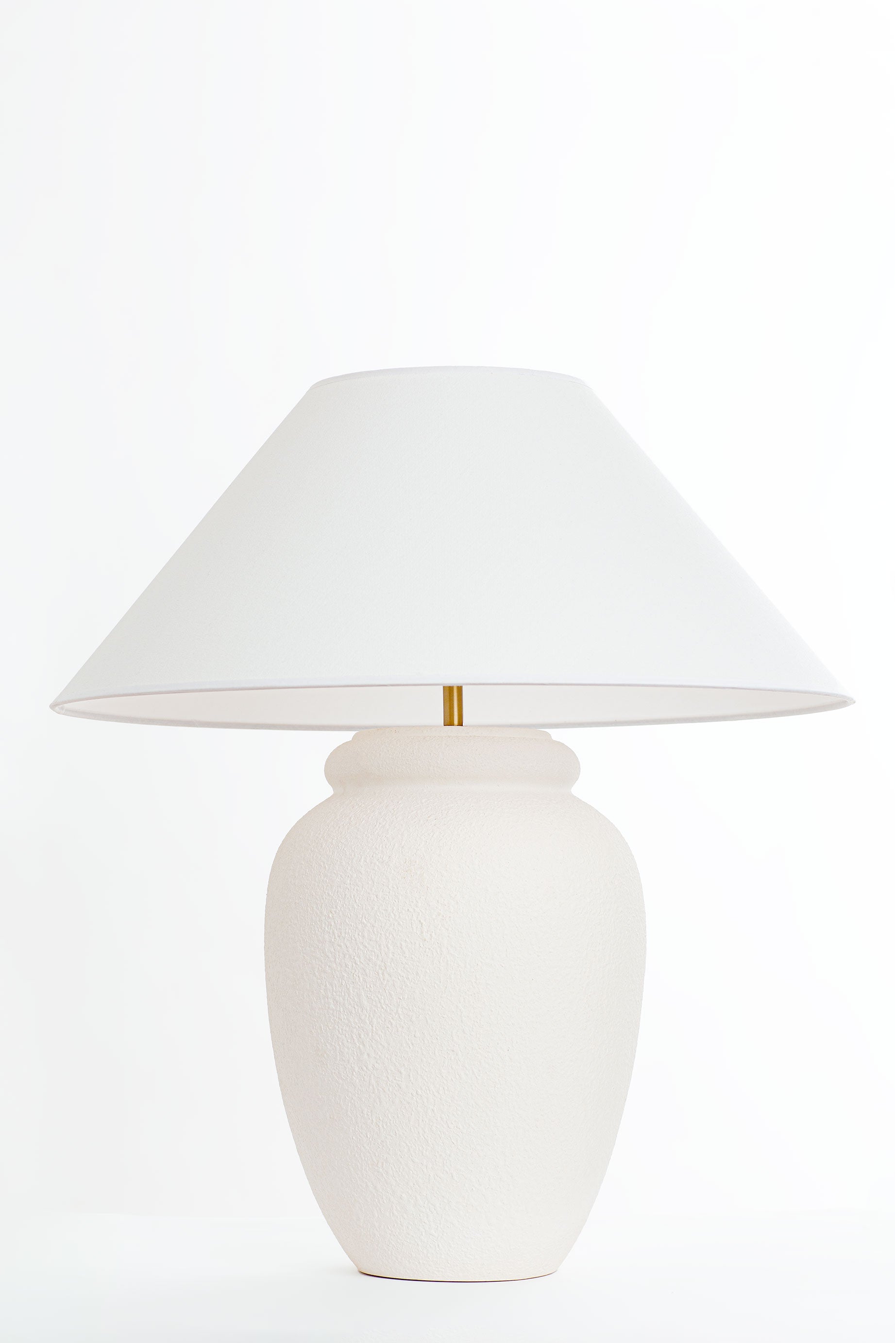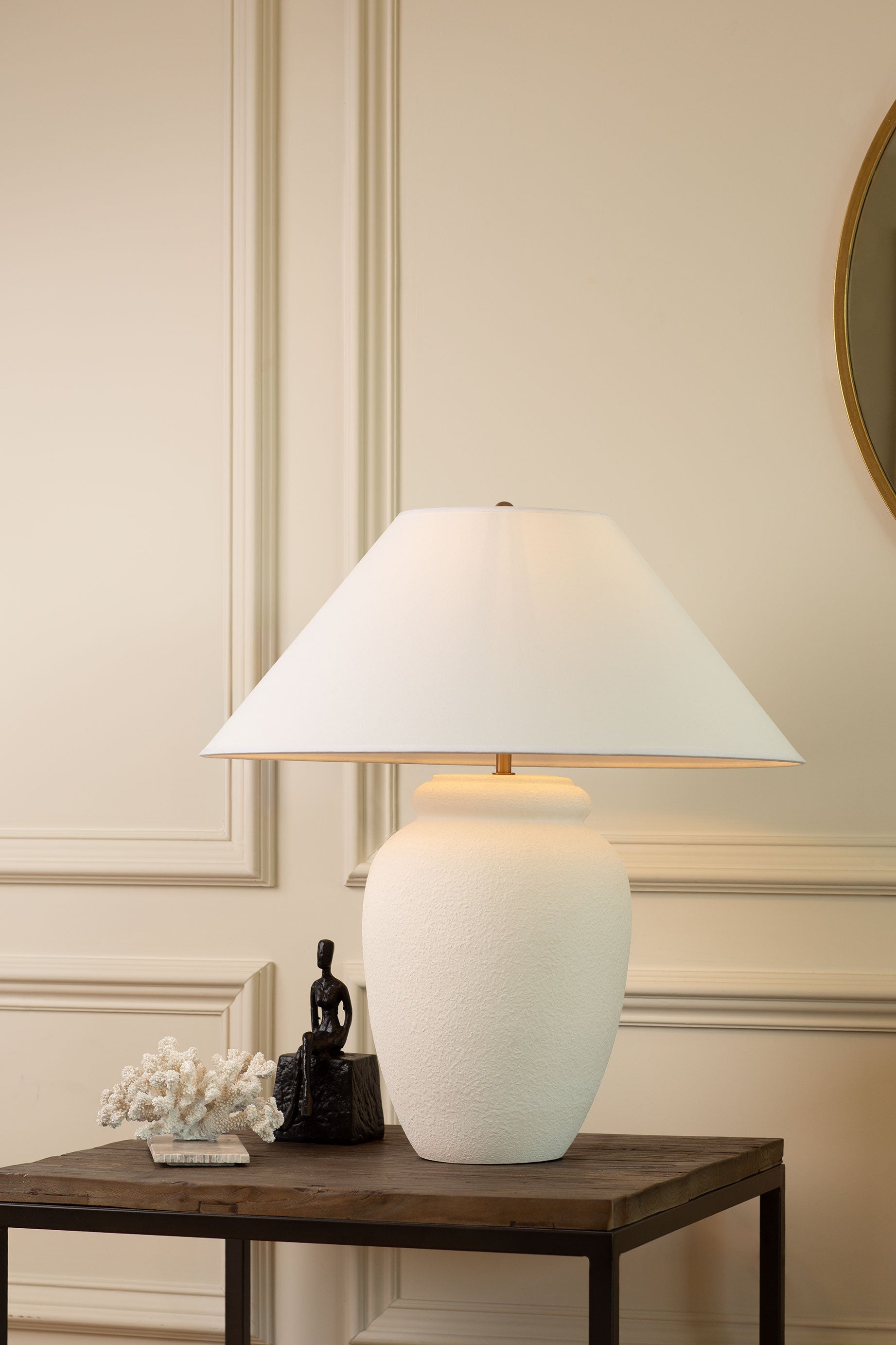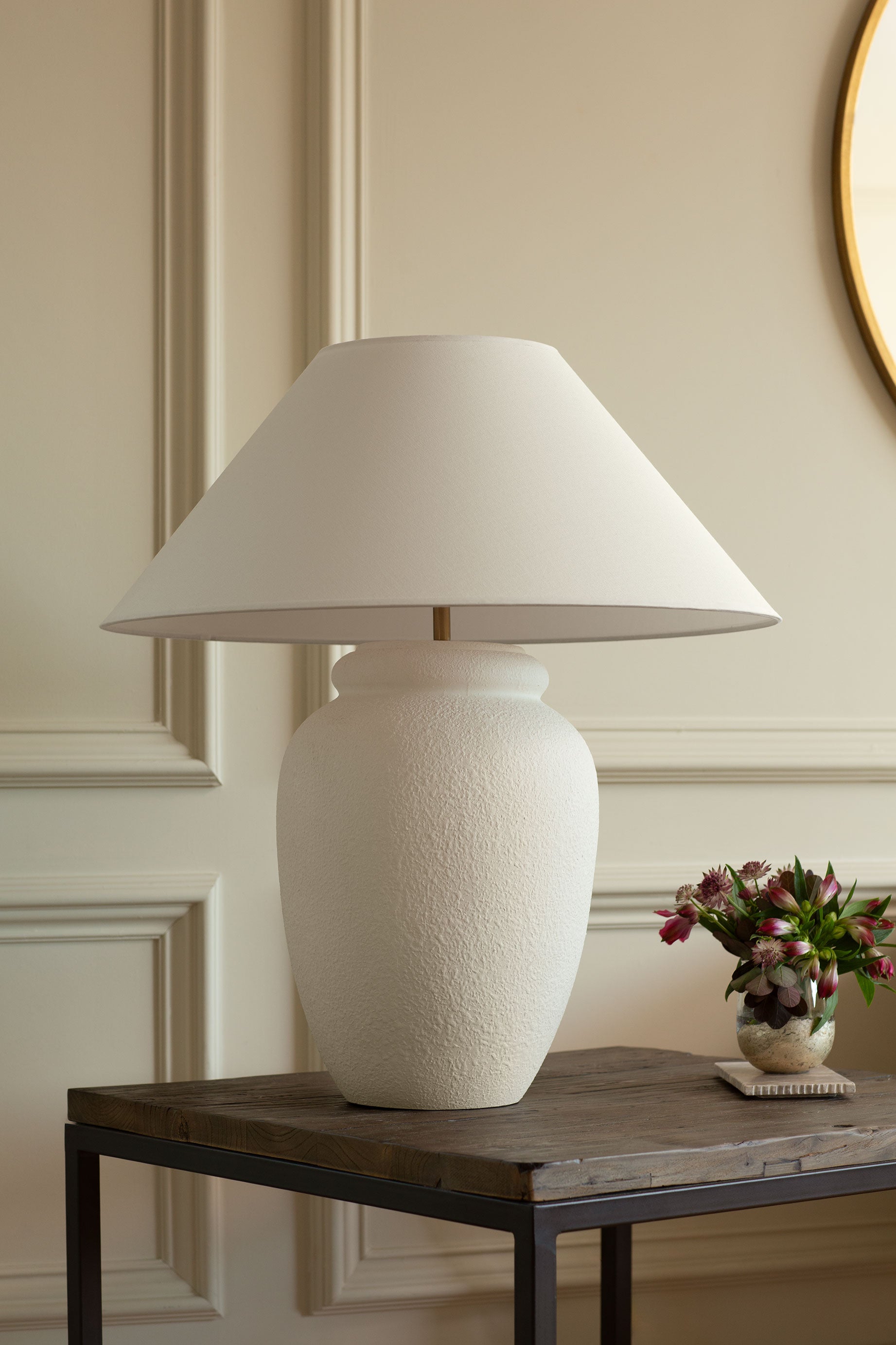 The Persis table lamp is the largest piece of the collection - a lamp of scale, texture, and quiet grandeur. Its organic base and Belgian-inspired shade create a balance between raw and refined. It anchors a space with ease, bringing warmth and softness through its sculptural form and muted palette.